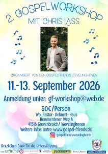 im April vergangenen Jahres haben wir erstmals einen Gospel-Workshop mit Chris Lass veranstaltet und wir denken immer noch voller Freude und Stolz daran zurück. Es war ein energiegeladenes Wochenende mit einem tollen Abschlusskonzert (Bericht hier).